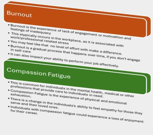 You may be at the point where you’ve heard or talked about self-care so much that skipping it doesn’t seem like a big deal. If we choose to skip out on self-care there can be significant consequences. If you are familiar with self-care, you may also be familiar with two other concepts burnout and compassion fatigue. For those of you who aren’t familiar with these terms, I’ll give you a quick overview: