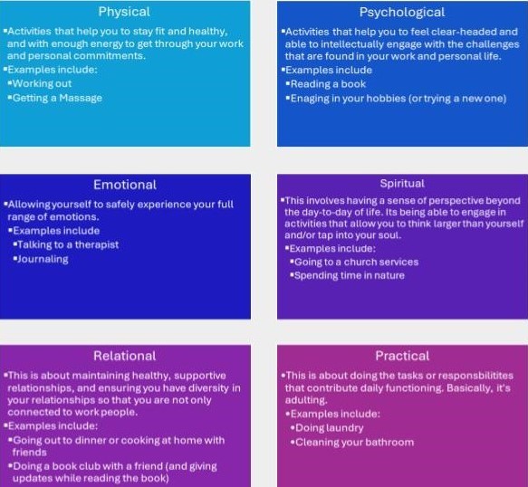 Once you have your answers I want you to go back to the self-care categories and see how your responses align with the descriptions. You may learn something about yourself. It’s important to remember that everyone’s form of self-care, the activities that allow us to recharge, is different. There is no one size fits all.