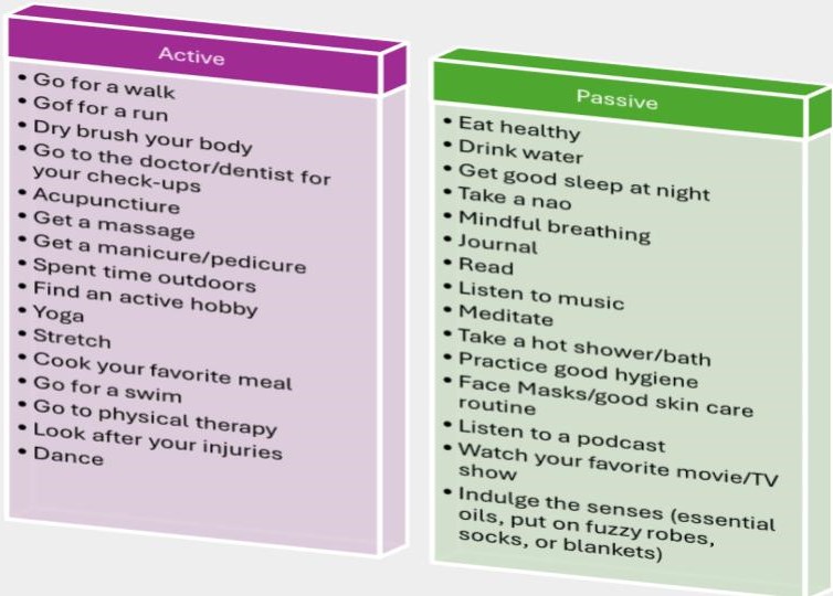 Physical Self-care are activities that help you stay fit and healthy, generating enough energy to help you get through your work and personal commitments. When I say fit and healthy I mean what makes sense for you to help you be able to accomplish your obligations. The chart below is a list of examples of ways to practice emotional self-care. It’s broken down into two categories: