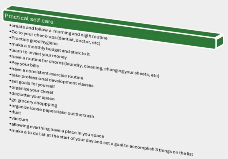 • Practical self-care are the things we have to do and usually the things we HAVE to do are not the things we want to do, nor are they the things we look forward to do.